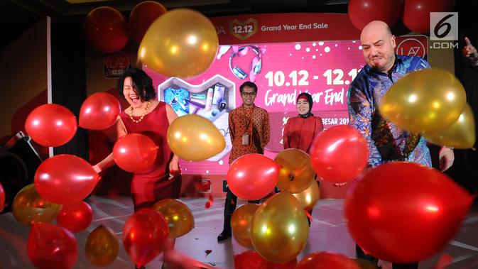 CEO Lazada Alessandro Piscini, Chief Marketing Officer Lazada Monika Rudijono, Head of Traffic Management Lazada Haikal Bekti, Seller Lazada Ambarwati Hadi saat peluncuran Lazada 12.12 Grand Year End Sale, Jakarta, Selasa (4/12).(Liputan6.com/AnggaYuniar)