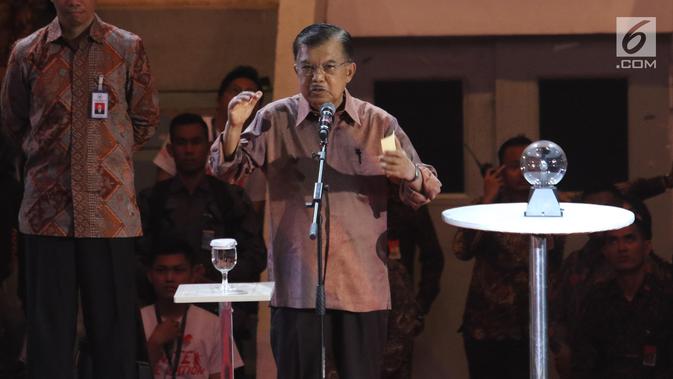 Wapres Jusuf Kalla saat meresmikan program Gerakan Nasional 1000 Startup Digital 2019 di Jakarta, Minggu (18/8/2019). Program ini merupakan salah satu upaya pemerintah untuk mendukung ekosistem ekonomi digital di Indonesia yang diharapkan digerakkan anak muda. (Liputan6.com/Angga Yuniar)