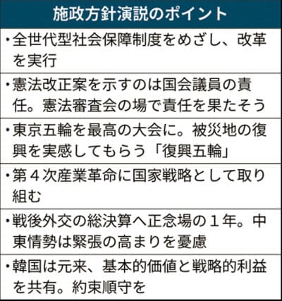 外交政策では「戦後外交を総決算し、新しい時代の日本外交を確立する正念場の1年」と位置づけた。米国とイランが対立する中東情勢を巡って「緊張の高まりを憂慮する」と自制を促した。「自衛隊による情報収集態勢を整え、日本関係船舶の安全を確保する」と中東派遣の意義を説明した。
